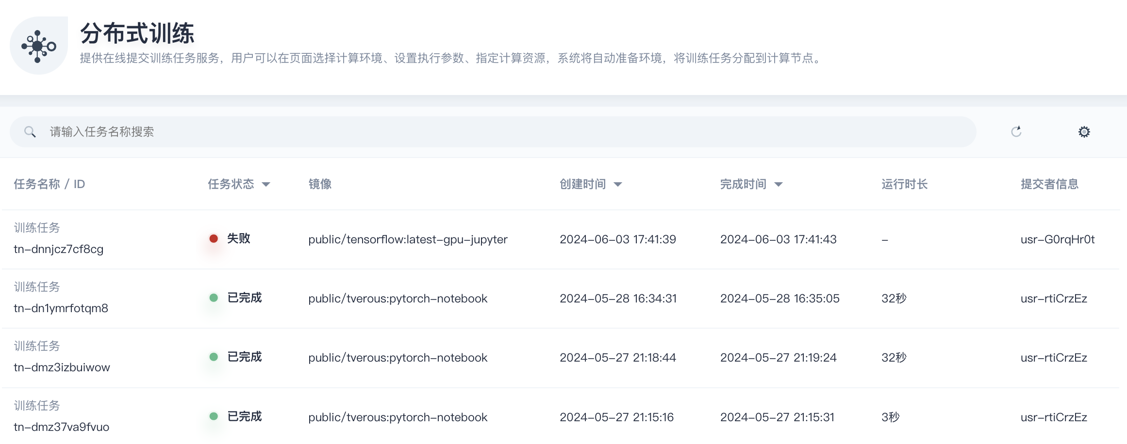 在分布式训练任务列表页面,可查看各任务的基本信息。